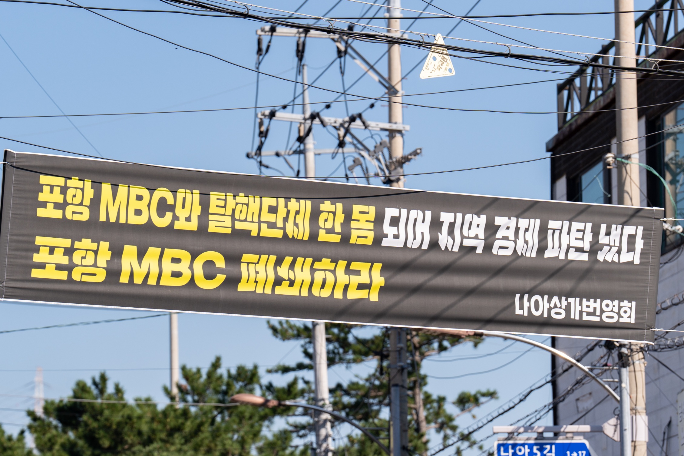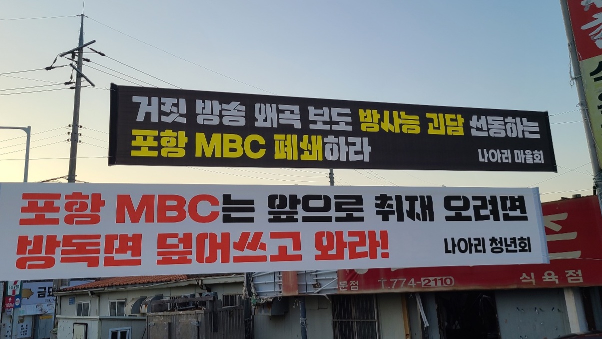 나아리 청년회는 "포항 MBC는 앞으로 취재 오려면 방독면을 덮어쓰고 오라"며 "청정지역을 방사능이 오염된 마을로 만들고 있다"고 현수막을 붙이고 토로했다.
