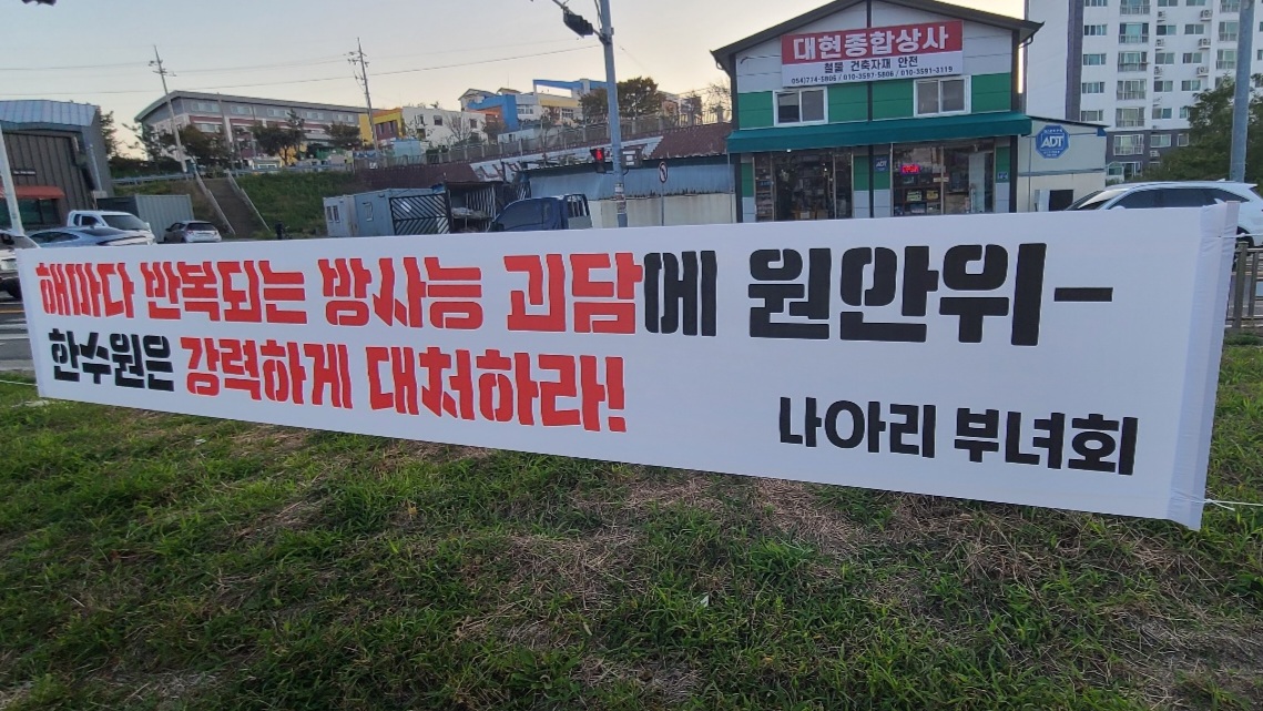 나아리 부녀회는 "해마다 반복되는 방사능 괴담에 원안위와 한수원은 MBC를 상대로 강력하게 대응하라"며 현수막을 붙였다.