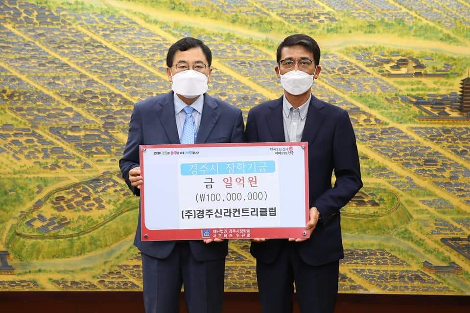 왼쪽/주낙영 경주시장과 신라CC김철년 대표이사경주 신라컨트리클럽 장학금 1억 통큰 기탁!경주신라CC 김철년 대표가 8일 경주시청을 찾아 지역을 이끌어 갈 인재육성을 위해 장학금 1억원을 기탁했다.경주시 신평동에 위치한