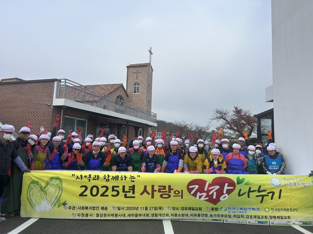 경주 감포읍 ‘사랑의 김장나누기’ 월성원자력본부의 후원 취약계층 200세대에 겨울김치 전달27일 감포읍 감포제일교회에서는 사회복지법인 해송(대표 송준석) 주관으로 「2025년 사랑의 김장나누기」 행사가 열렸다. 감포읍은