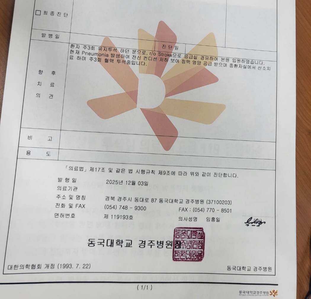 소견서에 따르면 “출혈 및 혈압저하로 뇌경색 새로 발생, 이후 폐렴 동반, 물도 삼키지 못하는 상태로 중환자실 치료 중.” 출혈 → 쇼크 → 뇌경색 → 폐렴 → 연하장애 → 중환자실로 이어지는 명백한 중대 의료사고의 임상 경과가 의심된다.